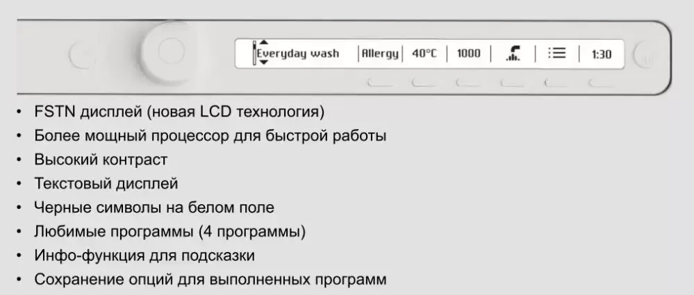 Оснащена функцией обычная экспресс-стирка (быстрая, ежедневная, короткая, освежить, экономичная, мини-программа).