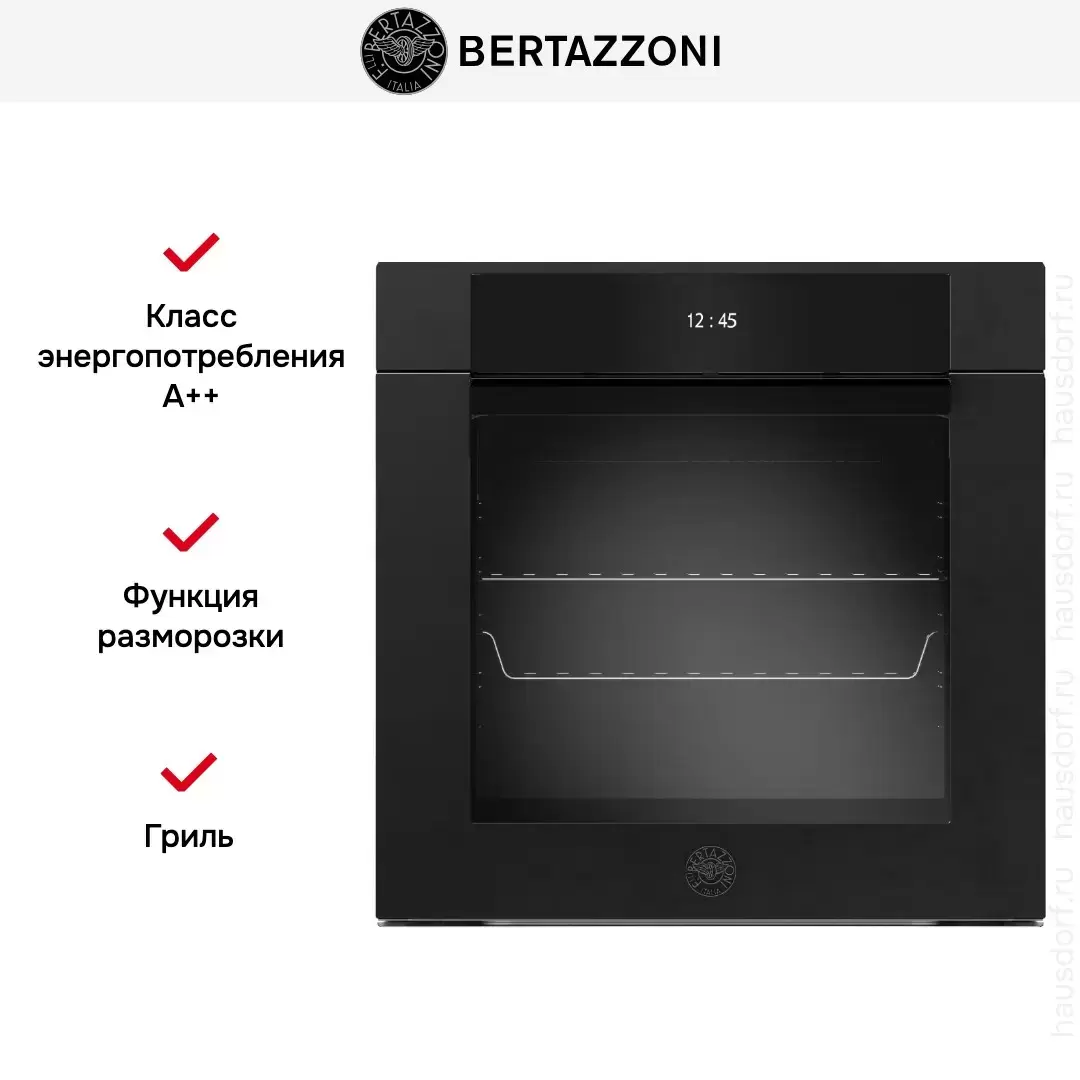 | Дополнительные параметры | Функция Bertazzoni assistant Функция пара Total steam Таймер длительности приготовления Отложенный старт Таймер окончания приготовления Плавное закрытие дверцы 1 уровень телескопических направляющих Двойное боковое освещение Расстойка теста |