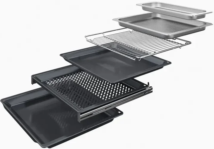 | Комплектация | Телескопические направляющие (1-уровневые) Решетка Термощуп Универсальный противень Эмалированный противень Перфорированный противень из стали |
