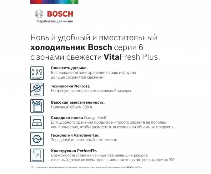 | Дополнительные параметры | Зона свежести VitaFresh Plus c переставляемым разделителем Потребляемая мощность (Вт): 100 Эко-режим Регулируемая температура морозильного отделения Температурный режим: 4 Тип штепсельной вилки: Вилка с заземлением |