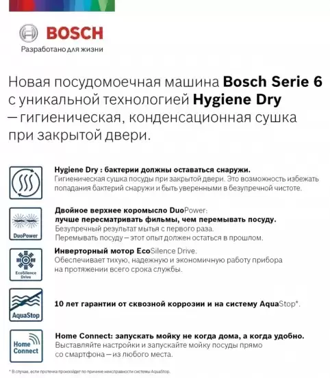 | Дополнительные параметры | Вместимость - 10 комплектов посуды + 1 сервировочный Время работы программы 1, мин: 220 Время работы программы 2, мин: 95-160 Время работы программы 3, мин: 115-125 Время работы программы 4, мин: 60 Время работы программы 5, мин: 240 Время работы программы 6, мин: 15 Параметры потребления воды Программа 1: 9.5 Параметры потребления воды Программа 2: 7-14.5 Параметры потребления воды Программа 3: 10.5-13 Параметры потребления воды Программа 4: 10 Параметры потребления воды Программа 5: 9.6 Потребление воды на программе Эко 50 C°: 9.5 л Потребление электроэнергии Программа 1: 0.91 Потребление электроэнергии Программа 2: 0.65-1.1 Потребление электроэнергии Программа 3: 1.09-1.2 Потребление электроэнергии Программа 4: 1.05 Потребление электроэнергии Программа 5: 0.8 Потребление электроэнергии Программа 6: 0.05 Температура Программа 1: 50 Температура Программа 2: 45-65 Температура Программа 3: 70 Температура Программа 4: 65 Температура Программа 5: 50 Home Connect Home Connect Features: Удаленный мониторинг и контроль Длина отводящего шланга (см): 205 Длина подводящего шланга (см): 165 Длина сетевого кабеля (см): 175 Тип соединения: Wi-Fi Бесщёточный мотор EcoSilenceDrive с инверторным управлением обеспечивает эффективную работу с минимальным уровнем шума и сокращает расход воды Время автоматического выключения сети: 2.0 Макс. температура поступающей воды (°C): 60 Параметры потребления воды Программа 6: 4 Предохранители (А): 10 Продолжительность цикла на программе Эко 50 C°: 220 мин Расход воды сокращается благодаря её попеременной подаче в верхнее и нижнее коромысло Тип штепсельной вилки: Вилка с заземлением Энергопотребление в режиме ожидания (W) (2010 / 30 / EC): 0.50 Потребление в режиме выключения (Вт): 0.50 |