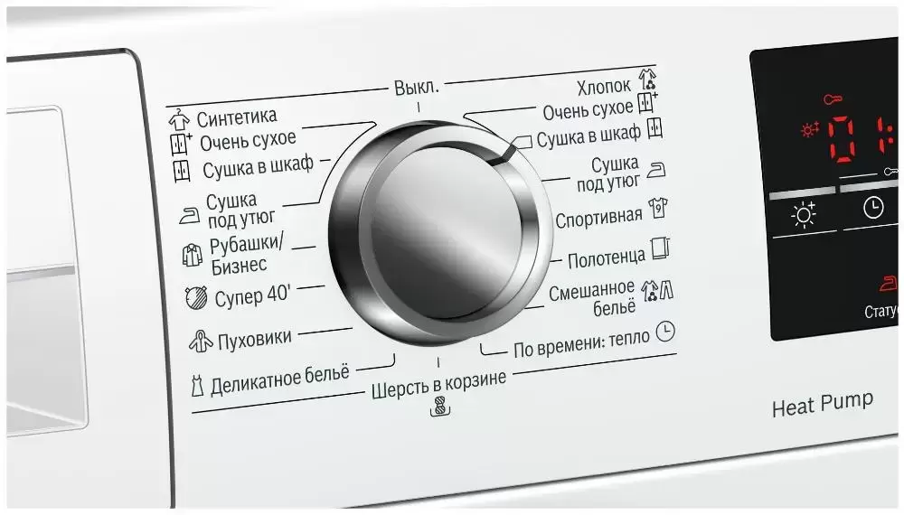 Оснащена сушка по времени, сушка в корзине и самоочистка конденсатора.