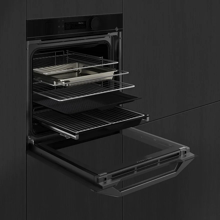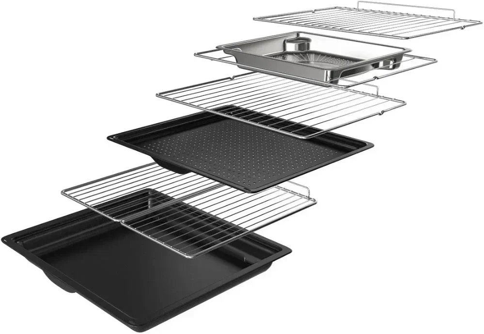 | Комплектация | Телескопические направляющие (1-уровневые) Решетка (2 шт) Глубокий противень Перфорированный противень из стали Неперфорированный стальной противень |