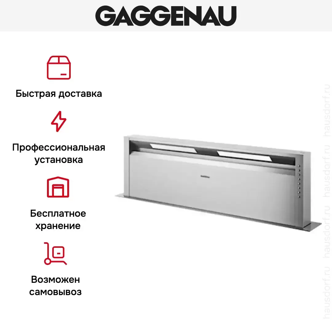 | Дополнительные параметры | Максимальная производительность вытяжки зависит от используемого вытяжного элемента. Светодиодное освещение с функцией Dimm. Сменные решетки для закрытия выходного отверстия для воздуха. Высококачественная обработка: рама из 3 мм нержавеющей стали. Для установки на столешницу или заподлицо. Выдвижная вытяжка комбинируется со всеми варочными панелями Gaggenau. При необходимости полностью утапливаемая в столешницу. |