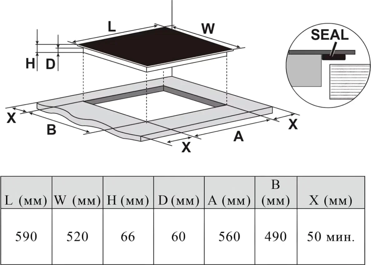 | Размеры ниши для встраивания (Ш х Г), см | 56х49 |