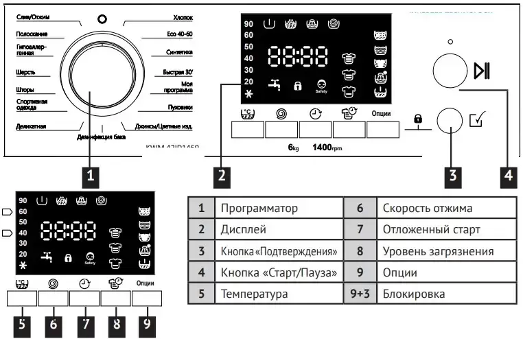 | Индикация | Времени до окончания стирки Выбора дополнительных функций |