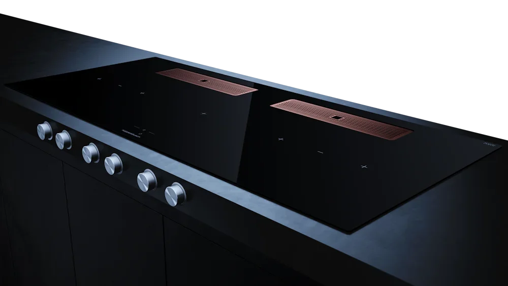 Индукционная варочная поверхность с вытяжкой Kuppersbusch KMI 12850.0 SR-E Copper — варочная панель класса люкс, немецкого производства, сочетающая надёжность и передовые технологии Küppersbusch.