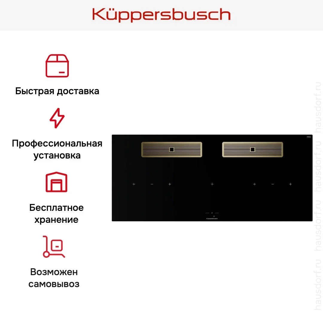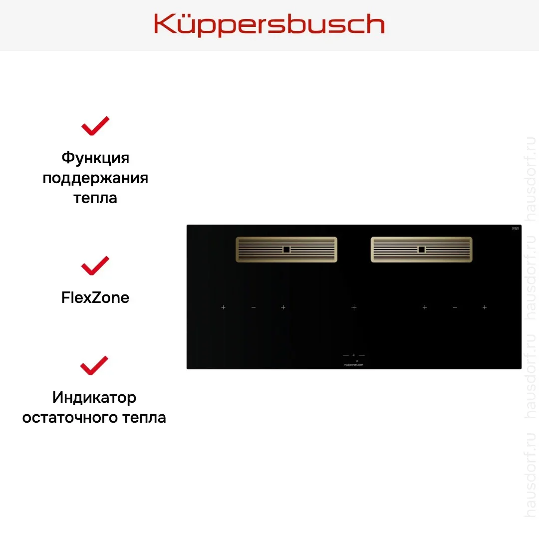 Индукционная варочная поверхность с вытяжкой Kuppersbusch KMI 12850.0 SR-S Gold — флагманская модель в линейке Küppersbusch (немецкого производства), варочная панель премиум-класса.