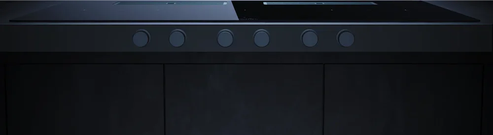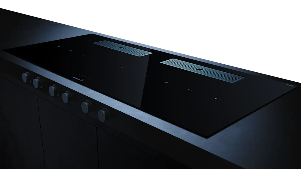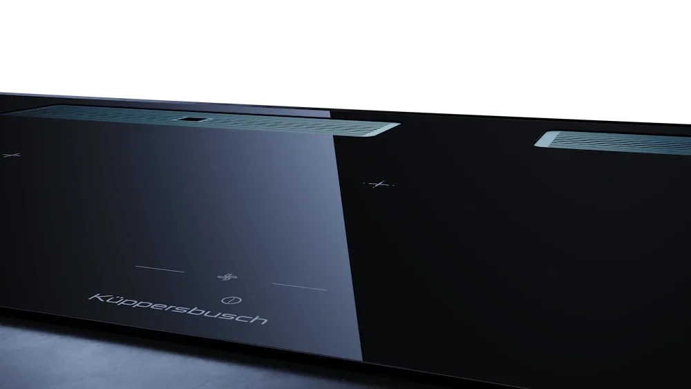 Индукционная варочная поверхность с вытяжкой Kuppersbusch с чёрными ручками KMI 12850.0 SR-S Stainless steel — флагманская модель в линейке Küppersbusch (немецкого производства), варочная панель премиум-класса.