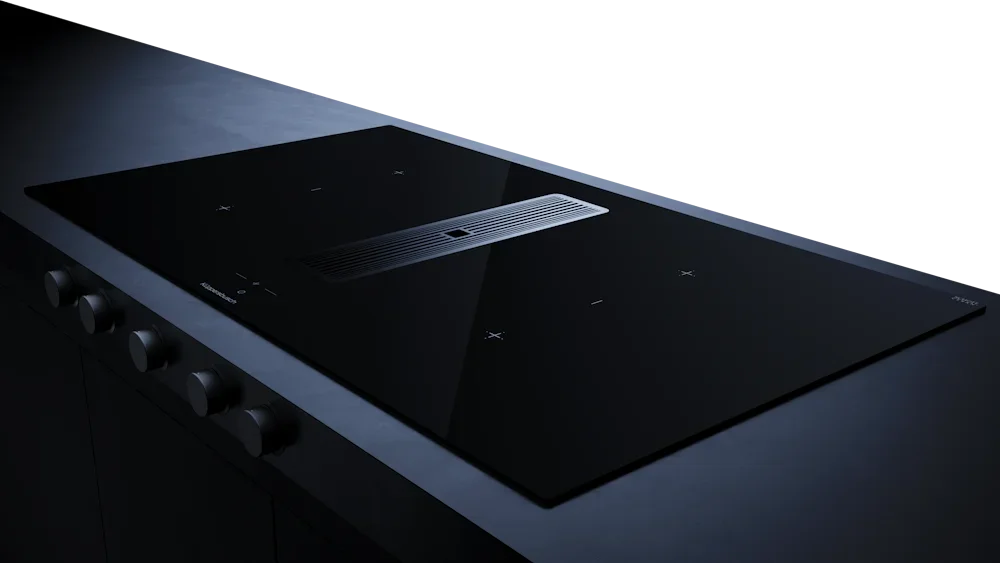 Индукционная варочная поверхность с вытяжкой Kuppersbusch KMI 9850.1 SR-E Black Chrome — флагманская модель в линейке Küppersbusch (немецкого производства), варочная панель премиум-класса.