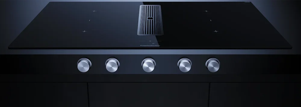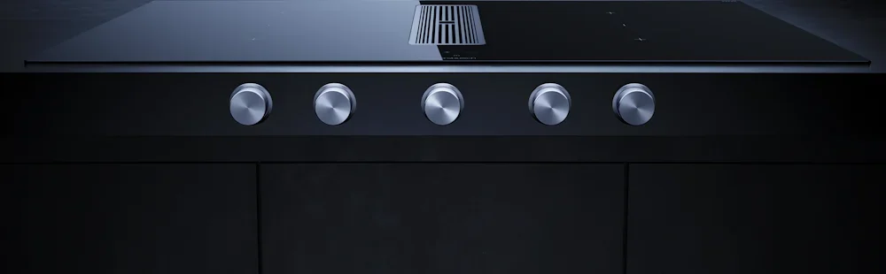 Индукционная варочная поверхность с вытяжкой Kuppersbusch с ручками из нержавеющей стали KMI 9850.1 SR-E Stainless steel — варочная панель премиум-класса от немецкого производителя Küppersbusch.