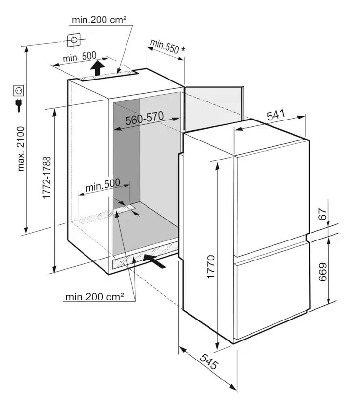 Тип: встраиваемый. Вид: холодильник с морозильником.