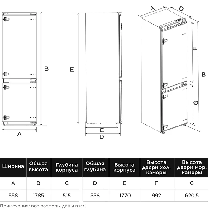 Тип: встраиваемый. Вид: холодильник с морозильником.