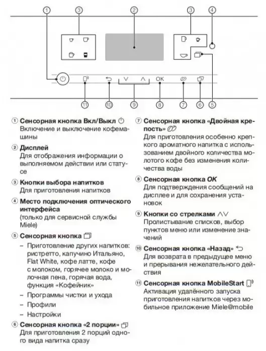 | Приготовление напитков | Эспрессо Двойной эспрессо Эспрессо макиато Двойной эспрессо макиато Капучино Капучино+ Латте Двойной латте Латте макиато Двойной латте макиато Кофе Двойной кофе Ристретто Двойной ристретто Флэт уайт Двойной флэт уайт Лунго Горячее молоко Молочная пена Кофейник Горячая вода |