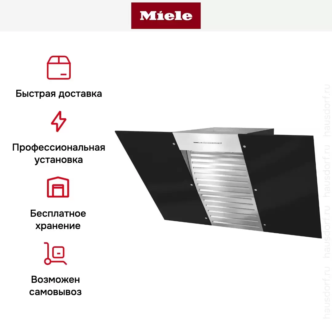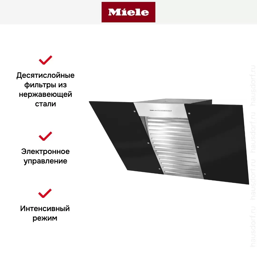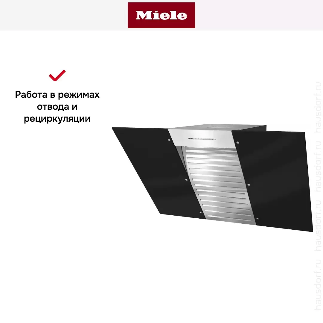 Con@ctivity 3.0 — Bluetooth с плитами Miele для автоматической работы. Wi-Fi Miele@home — удалённое управление, уведомления, мониторинг фильтров. Automatic Mode с датчиком пара анализирует испарения. RunOnTime 5-15 минут доработки. Interval Ventilation.