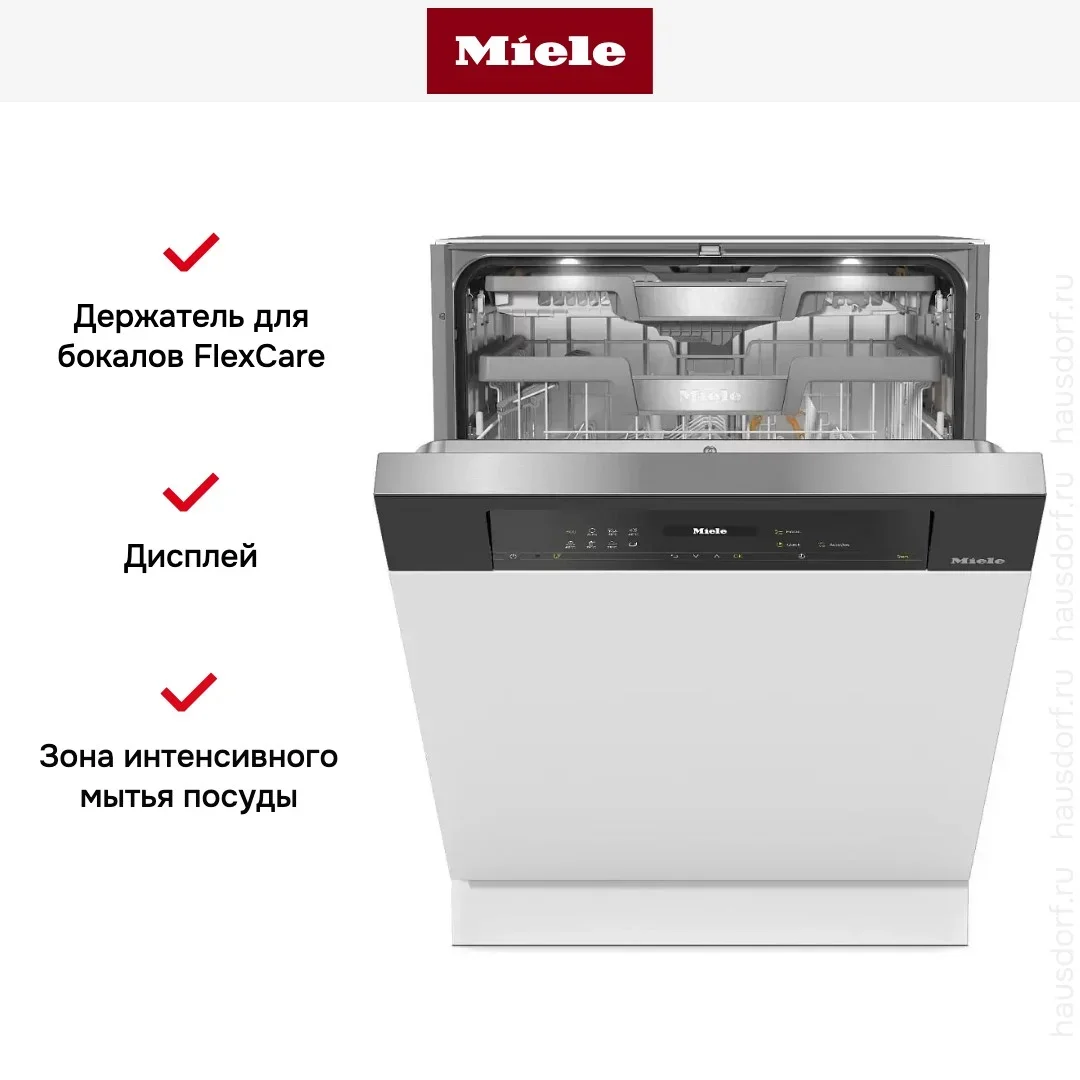 Miele G 7710 SCi AutoDos — частично встраиваемая посудомоечная машина Generation 7000 с видимой панелью управления и автоматическим дозированием AutoDos. Сочетает удобство AutoDos (PowerDisk 20 циклов) с визуальным контролем статуса мойки через внешнюю панель. 14 комплектов, 10 программ, Wi-Fi Miele@home.