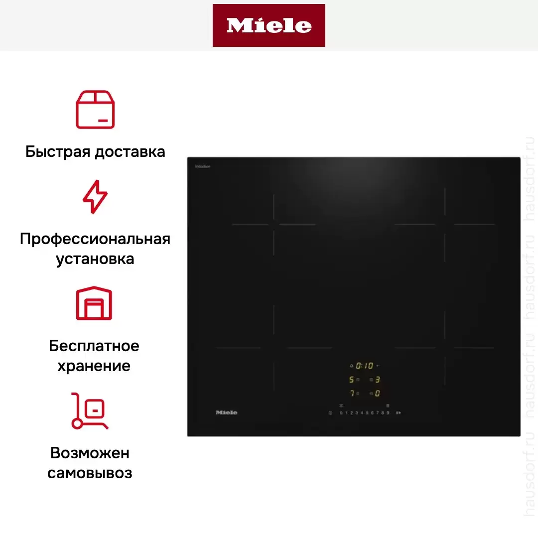 Габариты 606×527 мм, вырез 560×490 мм. Мощность 7,4 кВт — отдельная линия 380 В или 220 В 32 А. Сборка Miele (Германия). Brera — авторизованный дилер: гарантия 2 года, доставка и подключение мастером Miele в Москве включены в стоимость.