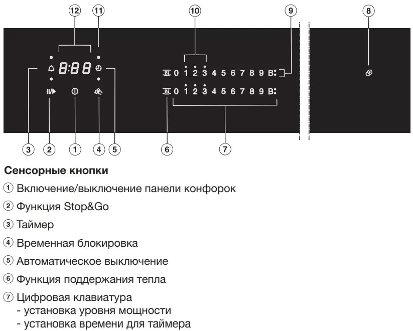 | Индикаторы | Индикатор остаточного тепла Индикация уровня мощности Индикатор неправильного размещения посуды |