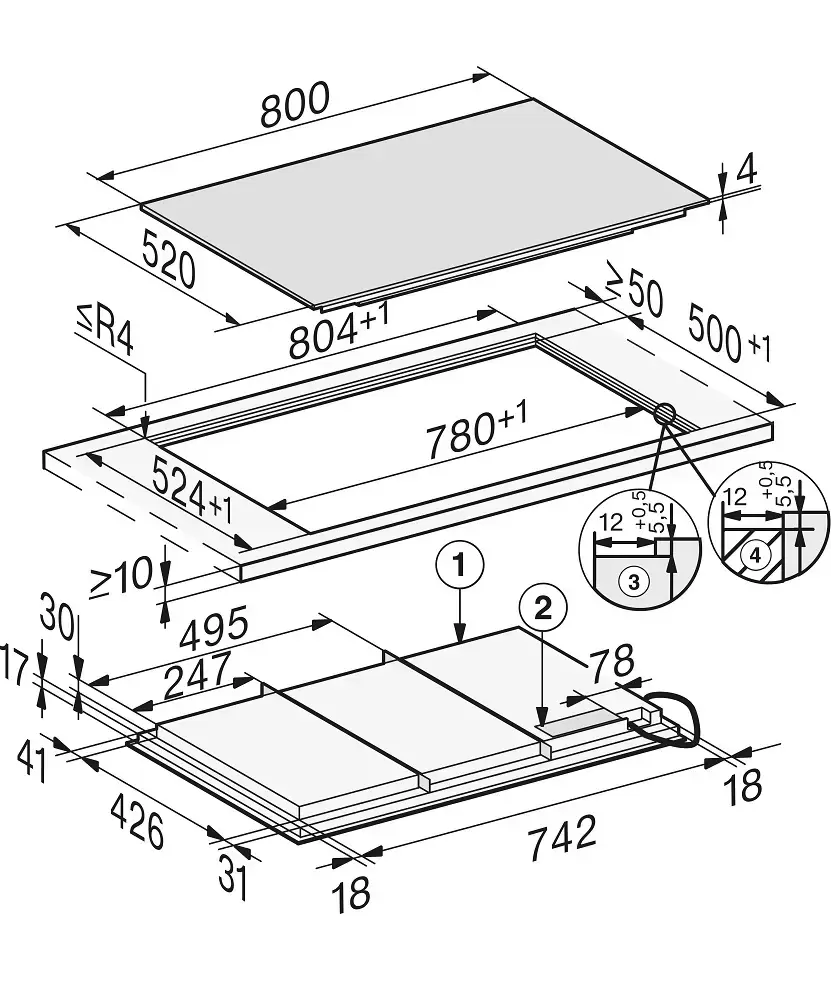 Габариты 806×527 мм, вырез 750×490 мм. Мощность 7,7 кВт — линия 380 В или 220 В 32 А. Сборка Miele (Германия). Brera — авторизованный дилер Miele в Москве: гарантия 2 года, доставка и подключение сертифицированным мастером Miele включены в стоимость.