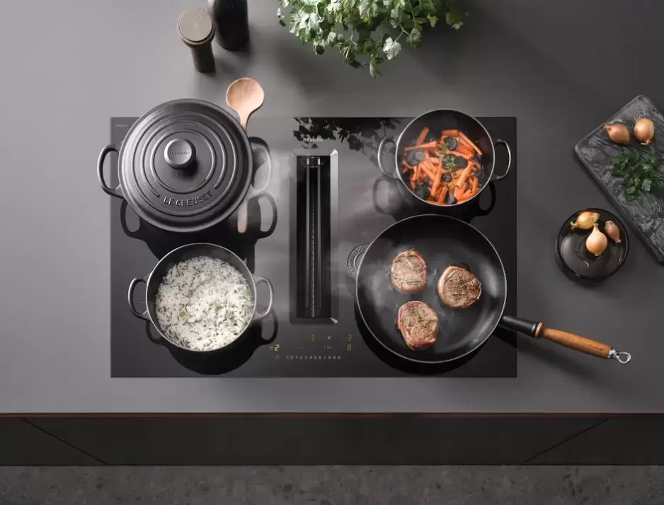 Четыре индукционные зоны общей мощностью 7,4 кВт. PowerFlex объединяет соседние зоны в удлинённые. TwinBooster до 6,6 кВт на зону. Автораспознавание ферромагнитной посуды: нагрев только под дном.