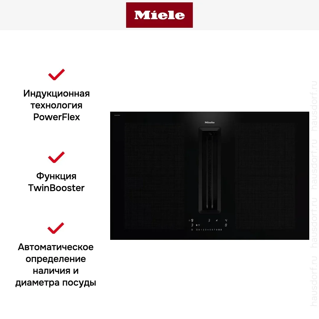 Габариты 906×527 мм, вырез 860×490 мм. Мощность 11,1 кВт + 0,24 кВт — требует линии 380 В или 220 В 32 А. Высота подстольного пространства 250+ мм для воздуховода. Сборка Miele (Германия). Brera — авторизованный дилер Miele в Москве: официальная гарантия 2 года, доставка и подключение сертифицированным мастером Miele включены в стоимость.