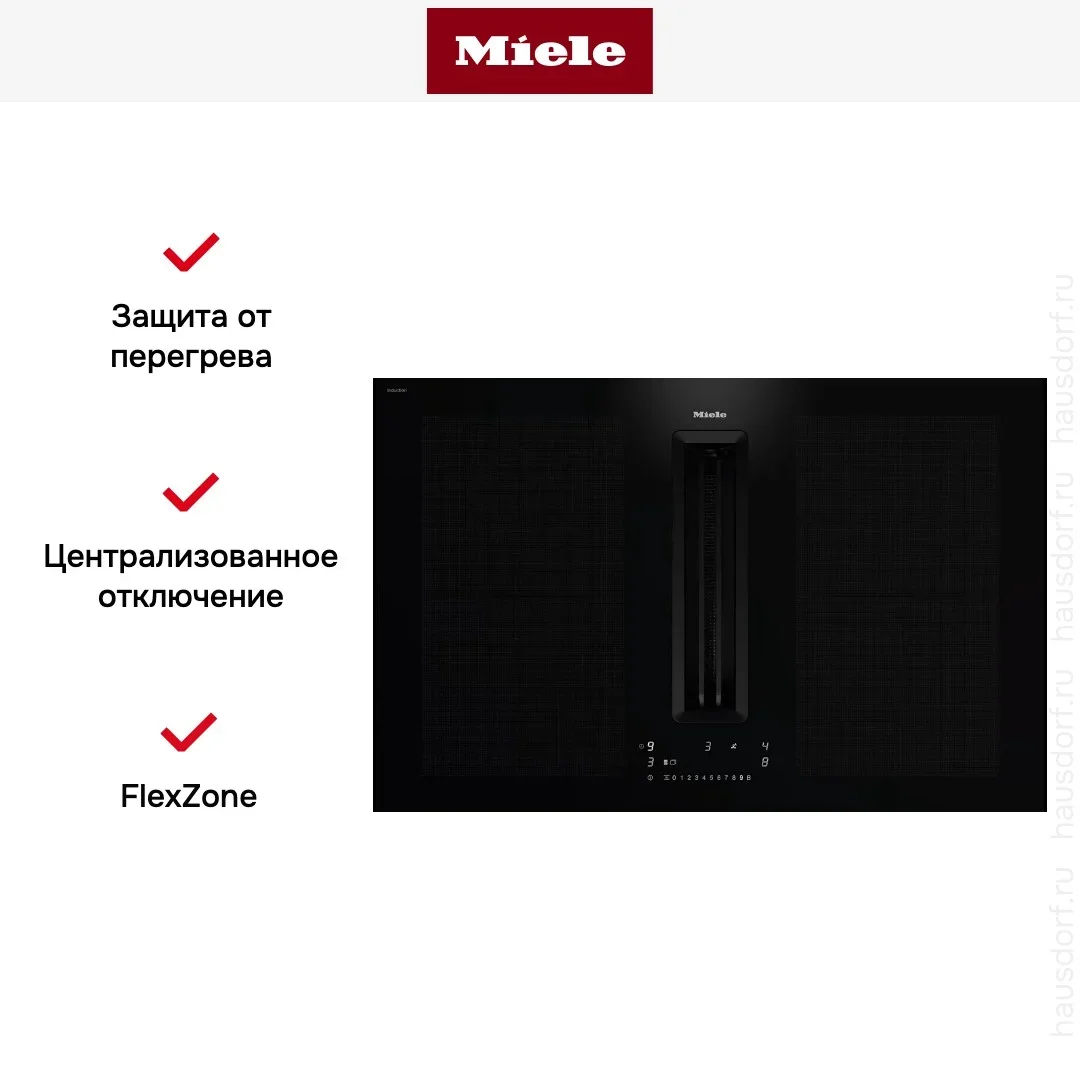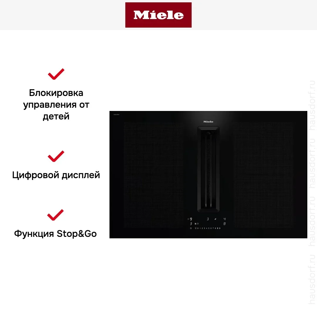 Сенсорная панель DirectSelect Plus с индивидуальными слайдерами мощности для каждой из 5 зон. Функции: Stop&Go (пауза готовки), Keep Warm (42-70 °C), таймер до 59 мин на зону, Recall, блокировка от детей. Wi-Fi Miele@home для удалённых уведомлений о завершении.