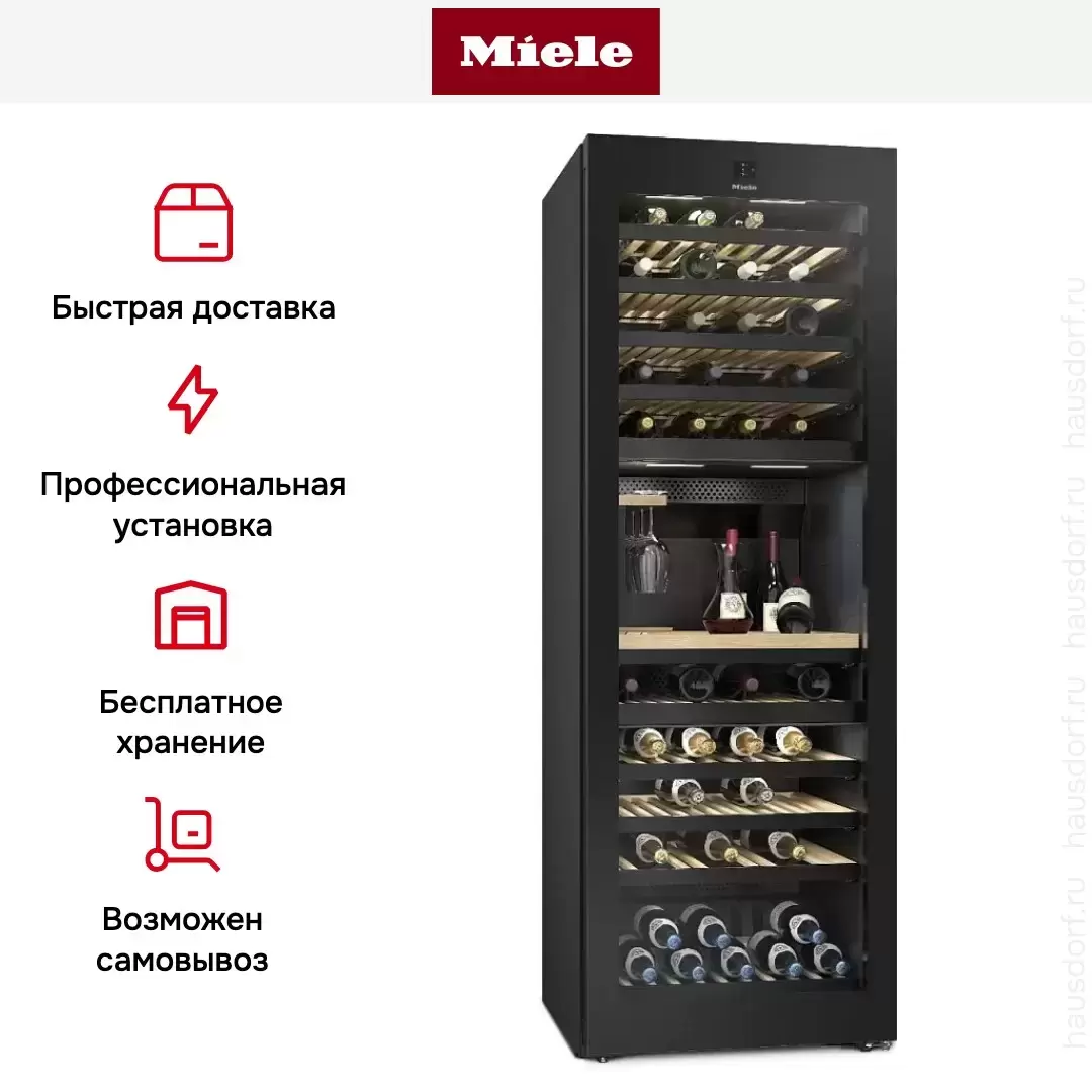Miele KWT 4999 F OBSW — отдельно стоящий (не встраиваемый) винный шкаф в обсидиан-чёрном корпусе с ёмкостью 178 бутылок и 3 температурными зонами. F — Free Standing (отдельно стоящий). Для частных домов, лофтов, открытых винных погребов в квартирах, ресторанов и премиум-баров. Дизайн с полным обзором коллекции через стеклянную дверцу — винный шкаф становится предметом интерьера. Сравним по ёмкости с KWT 2672 VIS MasterCool, но в отдельном корпусе без встраивания.