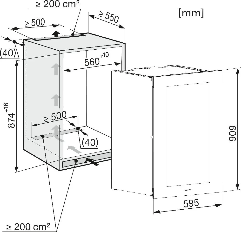 Вместимость 34 стандартные бутылки бордо. Компактный формат — высота ниши 45 см. FlexiFrame съёмные деревянные полки из массива бука с регулируемой высотой. Выдвижение на роликах с доводчиком.