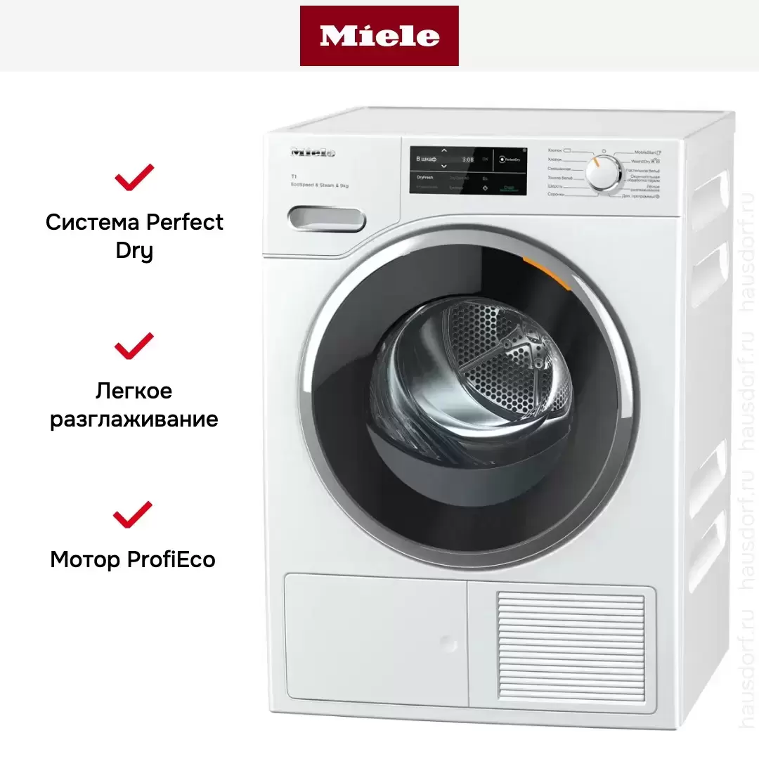 | Дополнительные параметры | Шланг для слива конденсата Функция AddLoad (дозагрузка белья) Выбор языка на дисплее Технология Wash2Dry: автоматическая синхронизация с программой стиральной машины Miele Функция EcoSpeed Функция EcoFeedback |