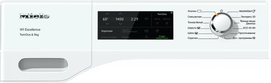 | Дополнительные параметры | Дверной упор справа Хромированные элементы в дизайне: кольцо люка, поворотный переключатель Однострочный дисплей DirectSensor Автоматизированное дозирование средств TwinDos Выбор языка управления MultiLingua Чугунные противовесы Оптический интерфейс В комплекте: 3 капсулы, UltraPhase 1 и 2, купон на 5 картриджей Miele UltraPhase Светодиодная подсветка барабана Глубина для встраивания под столешницу: 60 см |