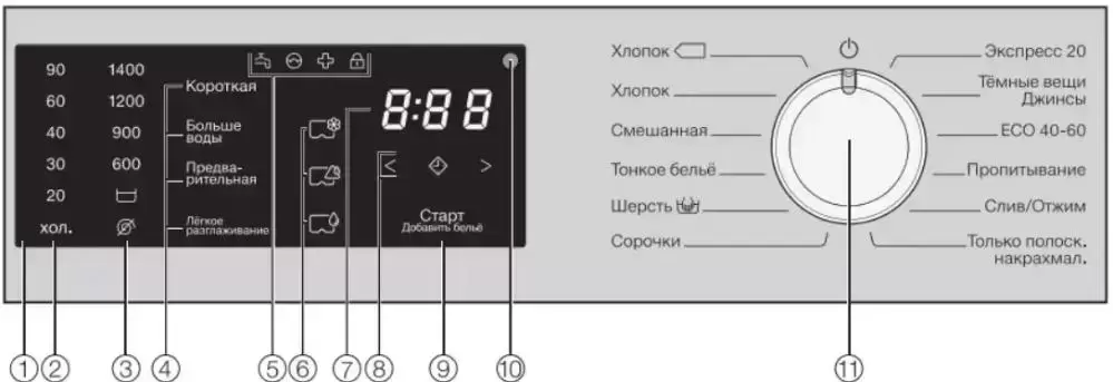 | Дополнительные программы | 20°С Экспресс 20 Хлопок Eco Слив / Отжим ECO 40-60 Без слива |