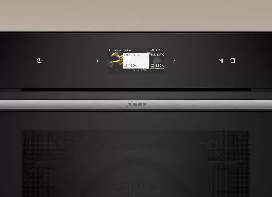 Цветной TFT-дисплей с сенсорным TouchControl. Все параметры готовки на одном экране, включая выбор паровых режимов. Часы, таймер, отсрочка. Home Connect — приложение Neff для смартфона: удалённый запуск программ, контроль готовки, push-уведомления, рецепты с автонастройкой режима пара. Защита от детей.
