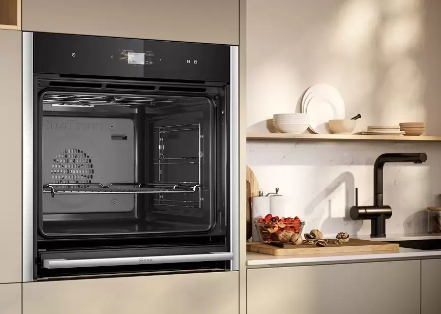 HIDE® — фирменная конструкция Neff: открытая дверца полностью убирается под камеру и не выступает в кухонное пространство. Свободный доступ к противню без выступающей створки. Особенно удобно при работе с увеличенной 56,9-см камерой — ощутимо больше рабочего объёма для больших противней. Фронт из нержавеющей стали с тонкой горизонтальной ручкой — классический стиль для серой/нейтральной палитры кухни.