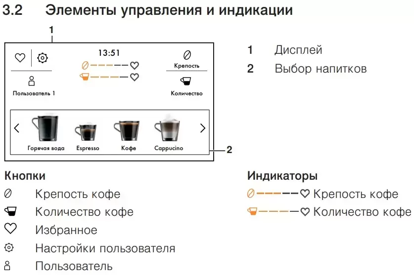 | Приготовление напитков | Эспрессо Двойной эспрессо Эспрессо макиато Доппио+ Капучино Латте Латте макиато Американо Кофе Ристретто Флэт уайт Лунго Горячее молоко Молочная пена |